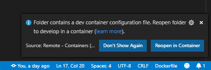 If you don't see this notification, open the command pallet (ctrl+shift+p) and select Remote-Containers: Reopen Folder in Container.